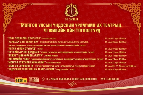 Тус театрын 70 жилийн ойн баярын тоглолтын хуваарийг танилцуулж байна.