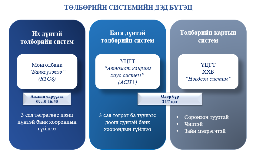 Монгол Улсын төлбөр тооцооны систем нь банк хоорондын их дүнтэй “Банксүлжээ” (RTGS) төлбөрийн систем, бага дүнтэй “Автомат клиринг хаус” (ACH+) төлбөрийн систем болон төлбөрийн картын систем гэсэн гурван дэд системээс бүрддэг. Монголбанкны зүгээс төлбөр системийн хэвийн үйл ажиллагааг ханган ажиллаж байна.