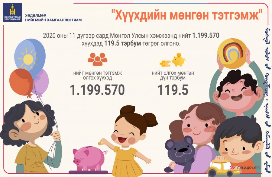 Хүүхдийн мөнгийг өнөөдрөөс олгож эхэлснийг Хөдөлмөр нийгмийн хамгааллын яам мэдээлжээ. Монгол Улсын хэмжээнд энэ оны 11 дүгээр сард нийт 1.199.570 хүүхдэд 119.5 тэрбум төгрөг олгоно.