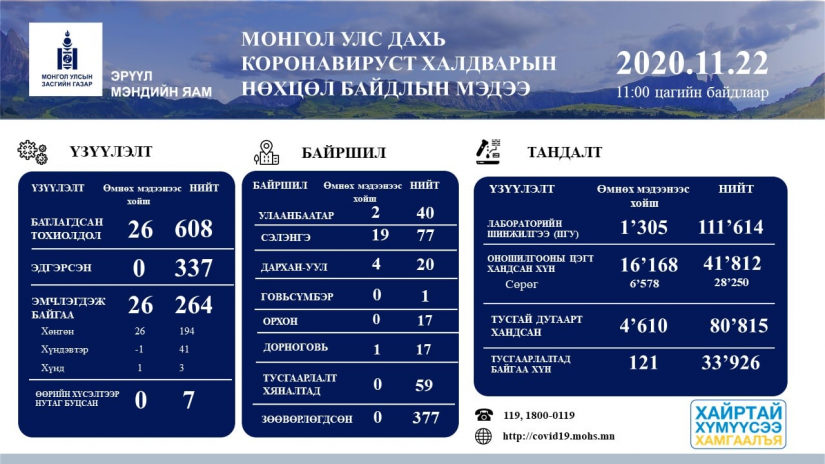Монгол Улсад коронавирусийн халдварын тохиолдол 26-гаар нэмэгдэж, 608 боллоо. Тодруулбал,