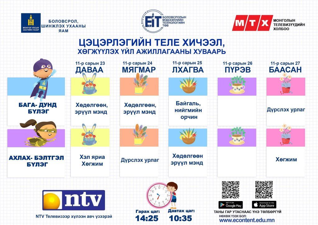 БШУЯ-аас бэлтгэсэн Теле хичээл Монголын телевизүүдийн холбооны 17 телевизээр ажлын өдрүүдэд гарч байна.