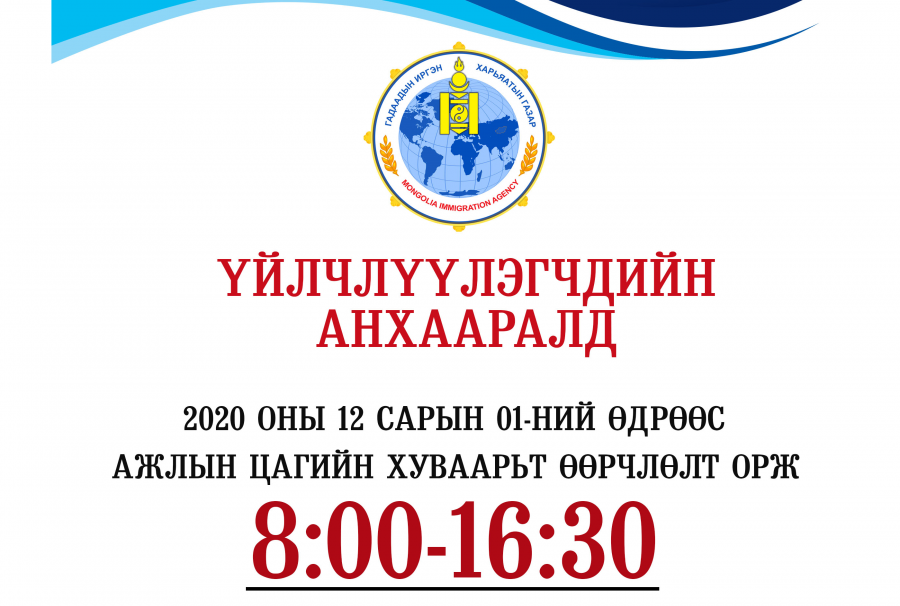 ГИХГ нь 2020 оны 12 дугаар сарын 01-ний өдрөөс ажлын цаг 08.00 цагт эхэлж, 16.30 цагт дуусахаар өөрчлөлт хийгдээд байна. Иймд гадаадын иргэн, түүнийг уригч иргэн, аж ахуйн нэгж, байгууллагууд дээр дурдсан цагийн хуваариар үйлчлүүлж байхыг Гадаадын иргэн, харьяатын газраас мэдээллээ.
