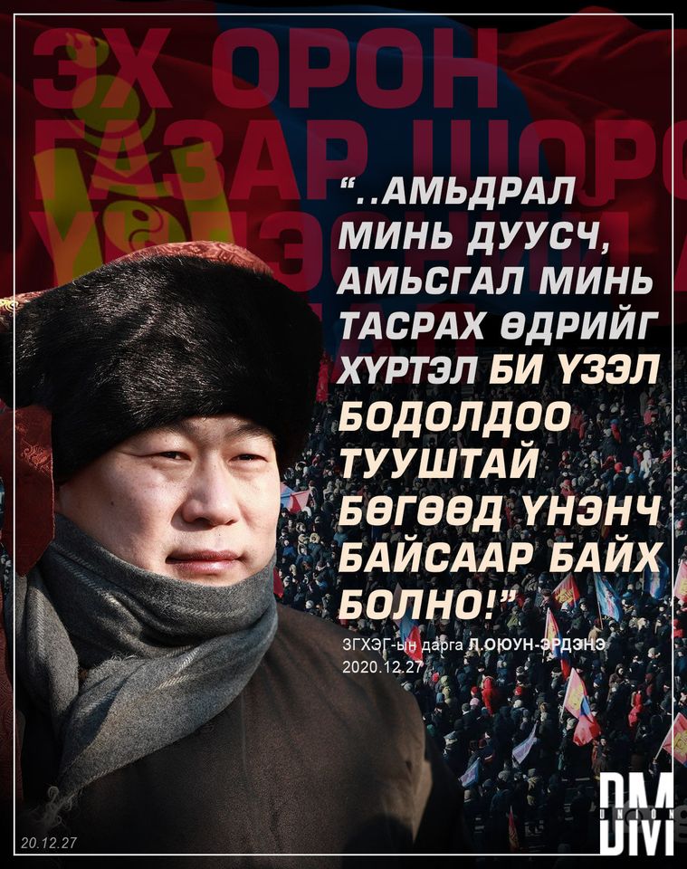 2018n оны 12 дугаар сарын 27-нд Сүхбаатарын талбайд "МАНАН дэглэмийн эсрэг Монгол түмний нэгдэл" нэртэй томоохон жагсаал болж байсан юм. 1990 оноос хойш болсон хамгийн том, тайван жагсаал хэмээн ажиглагчид тодорхойлсон байдаг. Улс оронд нүүрлэсэн шударга бус байдал, хууль шүүхийн дарангуйлал, нам дамнасан бүлэглэлээр дамжуулж улс төрийн эдийн засгийн хил хязгааргүй луйвар газар авсан зэргийг жагсагчид эсэргүүцсэн юм. Энэхүү жагсаалыг удирдагчдын нэг бол ЗГХЭГ-ын дарга Л.Оюун-Эрдэнэ юм. Тэрбээр хоёр жилийн өмнөх энэ өдрийг дурсаж цахим орчинд сэтгэгдлээ илэрхийлсэн нь олон нийтийн талархалыг хүлээв. Тэрбээр,