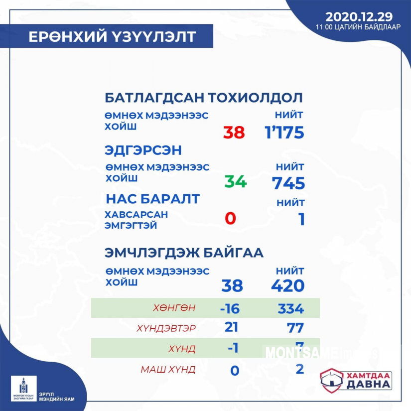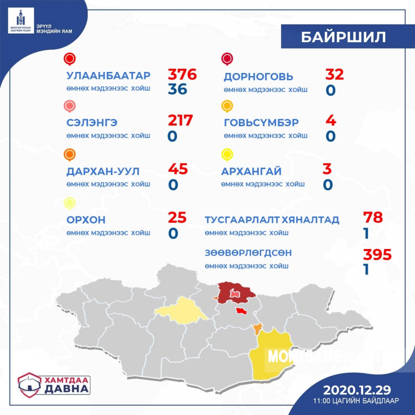 Сүүлийн 24 цагийн дотор Сэлэнгэ, Дархан-Уул, Говьсүмбэр, Орхон, Архангай, Дорноговь аймгийн голомтоос батлагдсан тохиолдол бүртгэгдээгүй. Дотоодын халдварыг өнөөдрийн байдлаар буюу 12 дугаар сарын 29-нөөр танилцуулбал: