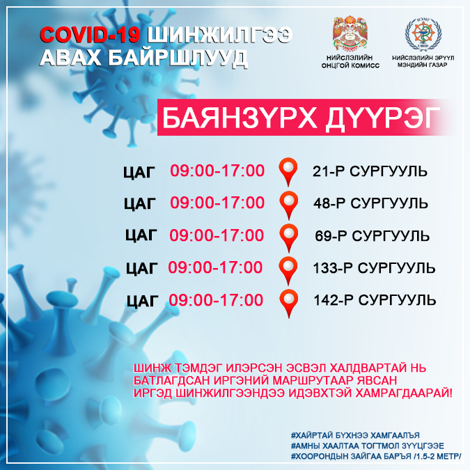 Шинжилгээ өгөх хүсэлтэй нийслэлийн иргэд харьяа дүүрэгтээ зохион байгуулж буй шинжилгээний төвд, харин орон нутгийн иргэд харьяалал харгалзахгүй дараах шинжилгээний төвүүдээр үйлчлүүлэх боломжтой юм.