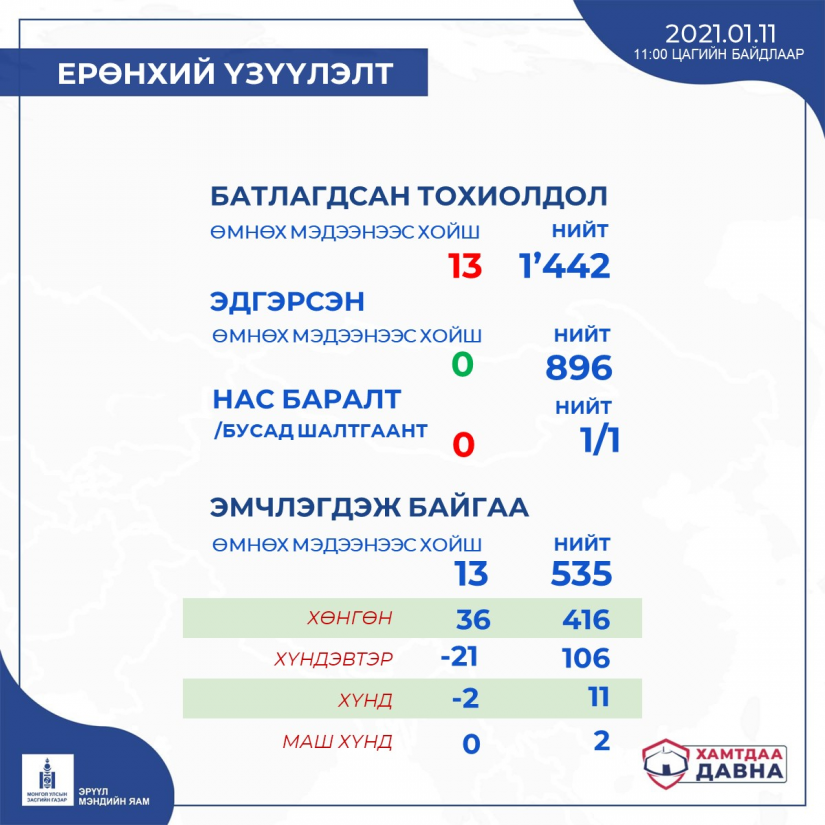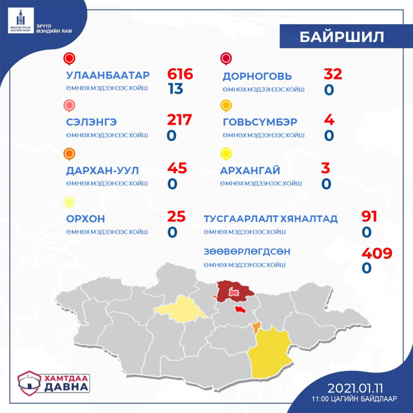 Шинээр илэрсэн тохиолдлууд Улаанбаатар хотод бүртгэгджээ. "Тэнүүн-Огоо" компаниас гаралтай гэр бүлийн халдвар, "Ачтан" эмнэлэг, "Мөнххада" ХХК-тай холбоотой буюу батлагдсан тохиолдлуудтай ойр харилцсан хүмүүсээс халдвар илэрсэн байна. "Ачтан" эмнэлгийн халдварын тохиолдол нийт 47 болсноос 21 нь эмнэлгийн ажилчид бол бусад нь гэр бүлийн хүмүүс, гэр бүлийн гишүүдээс дамжсан халдвар юм. "Тэнүүн-Огоо" компанийн хувьд жолооч нар тэдний гэр бүлийн гишүүд нийт 14 тохиолдол болж байна. "Мөнххада" ХХК-ийн 8 ажилтан, тэдний гэр бүлийнхэн гээд 25 тохиолдол бүртгэгджээ. Бусад аймагт сүүлийн 24 цагт коронавирусний халдвар бүртгэгдээгүй.