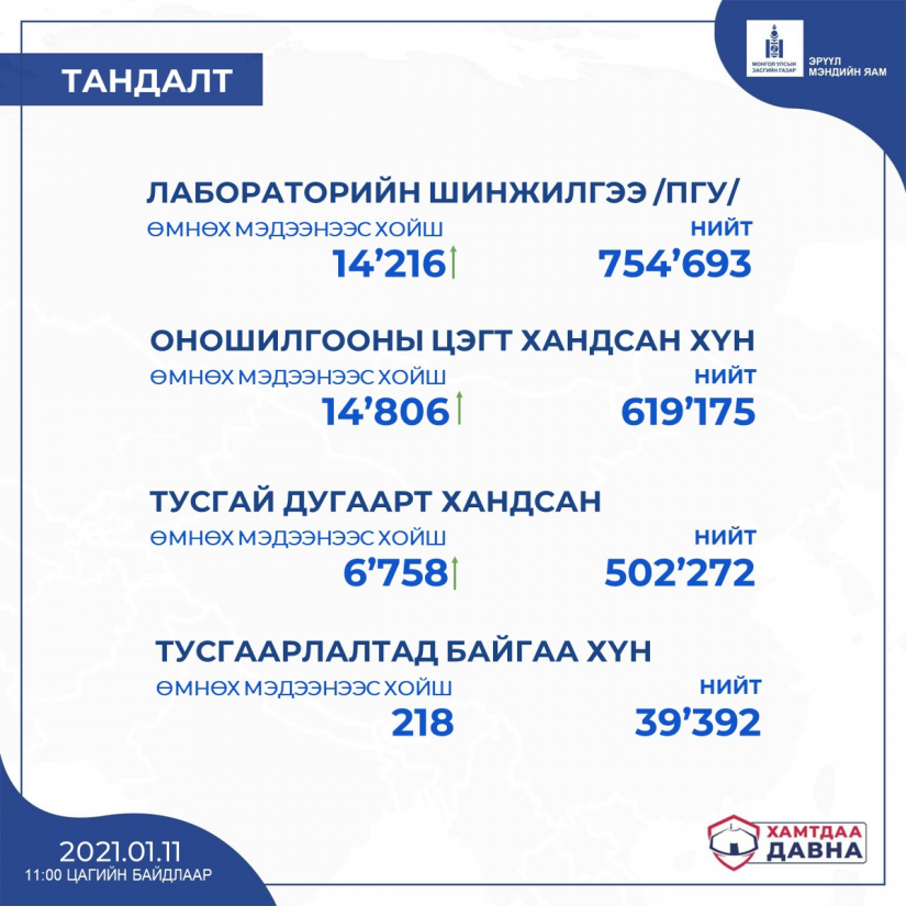 ХӨСҮТ-ийн вирус судлалын хоёр лаборатори, ЗӨСҮТ-ийн авто хоёр лаборатори, Сэлэнгэ, Дархан-Уул, Сэлэнгэ, Дорнод аймгийн салбар лабораторид нийтдээ 14 216 хүнд PCR-ийн шинжилгээ хийжээ.