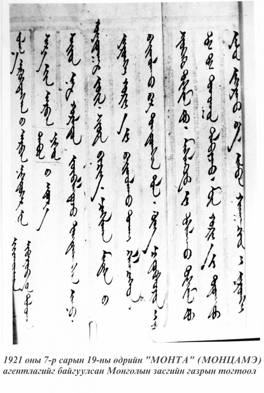 “МОНТА” /МОНЦАМЭ/ агентлагийг байгуулсан тухай 1921 оны 7 дугаар сарын 19-ний өдрийн Засгийн газрын тогтоол.
