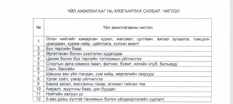 Захирамжид нийслэлийн нутаг дэвсгэрт өндөржүүлсэн бэлэн байдлын хугацаанд үйл ажиллагааг нь үргэлжлүүлэн хязгаарлах салбар, чиглэлийг хавсралтаар баталжээ.