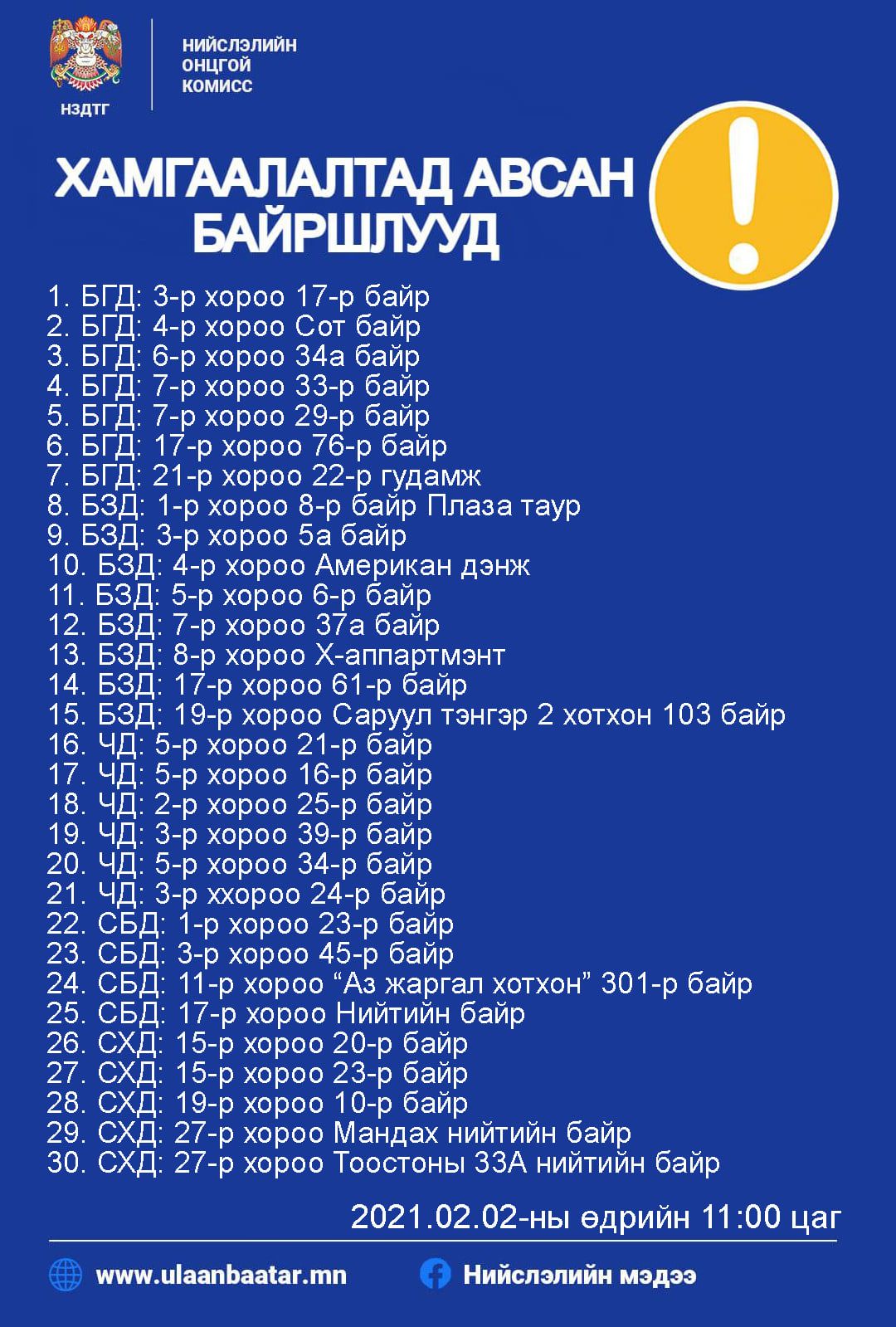 2021 оны 2 дугаар сарын 2-ны 11:00 цагийн байдлаар, иргэдийн шинжилгээний хариу сөрөг гарсантай холбогдуулан зарим байршилд тогтоосон хязгаарлалтыг буулгасан байна.