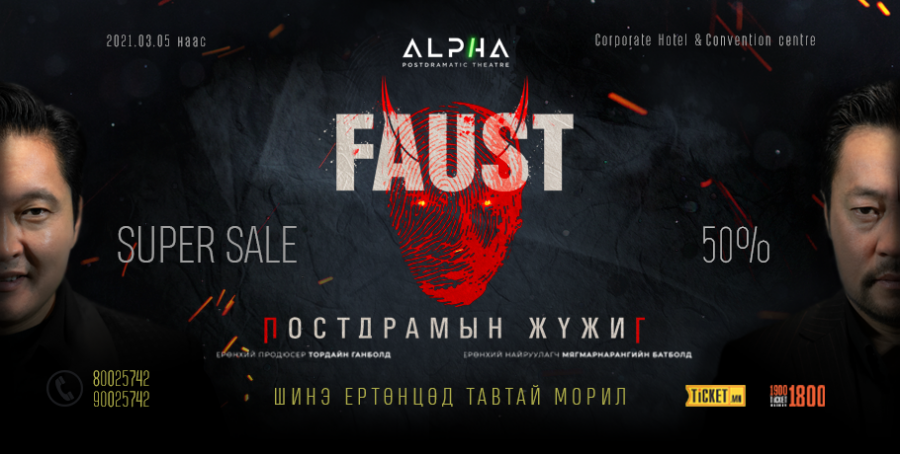 Дэлхий нийтийг хамарсан цар тахлын хорио цээрийн улмаас хойшлогдсон И.В.Гётегийн “Фауст” жүжгийг үзэгчдийн хүсэлтээр ирэх сарын 5-наас эхлэн “The Corporate Hotel and Convention Centre”-ийн тайзнаа тавих гэж байна.