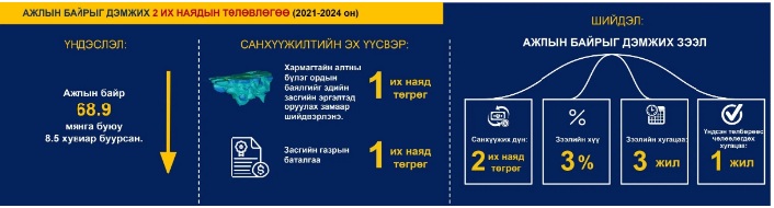 Ажлын байрыг дэмжих хоёр их наяд төгрөгийн зээлийг арилжааны банкаар дамжуулан жилийн гурван хувийн хүүтэй, гурван жилийн хугацаатай, эхний 12 сар хүртэл үндсэн төлбөрөөс чөлөөлөх нөхцөлтэй олгож эхэллээ.