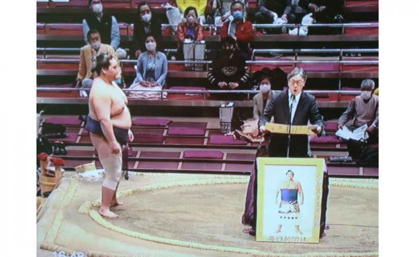 Токио хотноо болж буй мэргэжлийн сумо бөхийн хаврын тэмцээний 15 дахь өдөр Сэкиваке Тэрүнофүжи Г.Ган-Эрдэнэ, Озэки Такакэйшотой учраа тааран барилдаж, түүнийг ошидаши мэхээр хаяж, 12 даваатай, Озэки цолоо эргүүлж авсан төдийгүй Харү башёд түрүүлж Японы Эзэн хааны цомыг 3 дахь удаагаа хүртлээ.