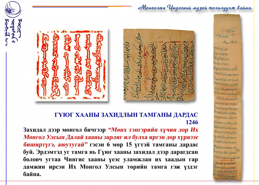 Энэ удаад Монголын Үндэсний музейн сан хөмрөгт хадгалагдаж буй Гүюг хааны захидлыг толилуулж байна.