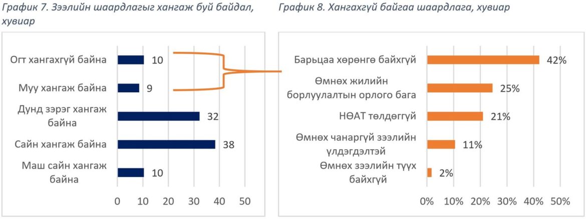 Судалгаанд хамрагдсан иргэн, ААН-үүд зээлийн шаардлагыг 48 хувь сайн хангаж байгаа бол, 32 хувь дунд зэрэг, 19 хувь хангахгүй байна.