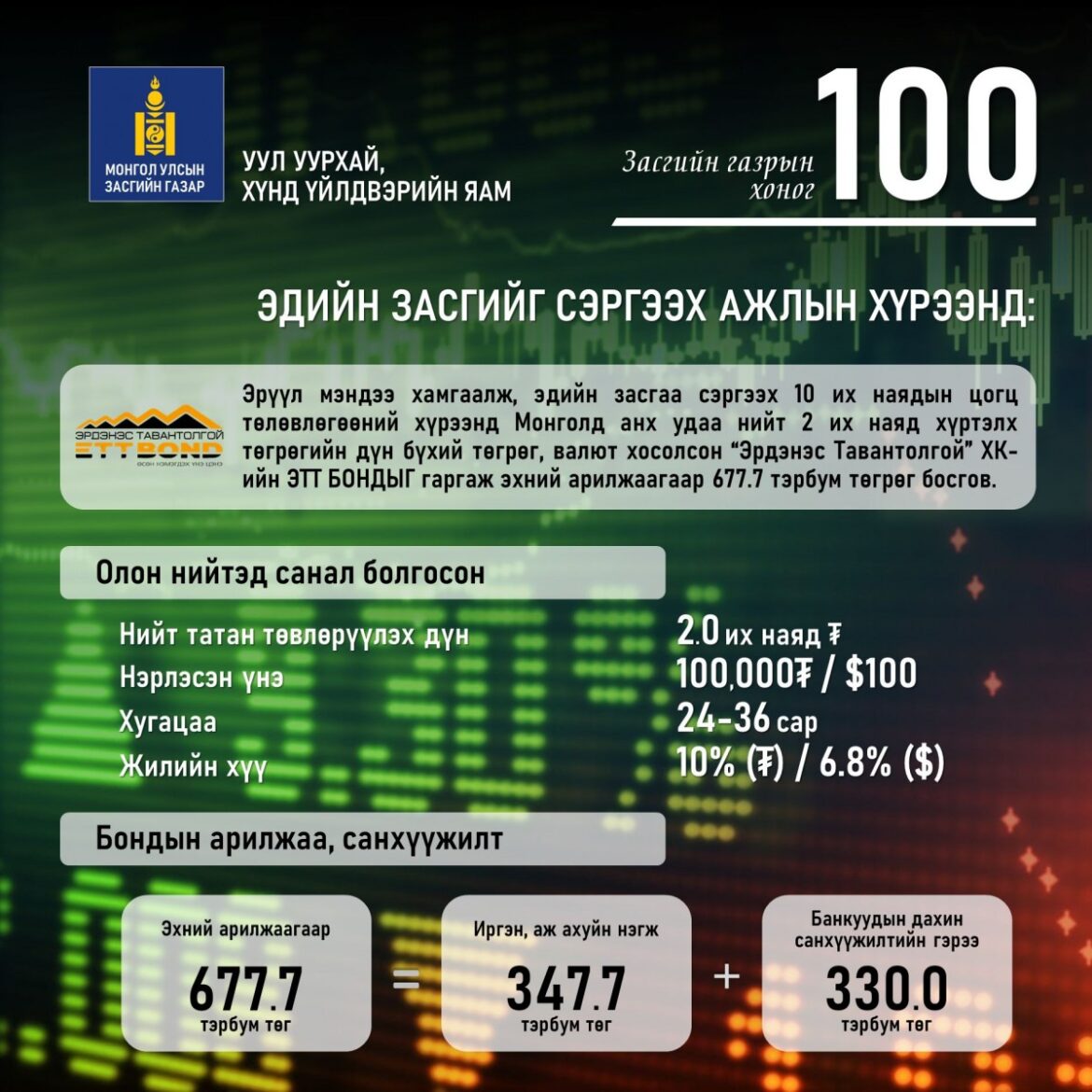 Монгол Улсын Засгийн газраас 100 хоногт хийсэн онцлох ажлуудыг салбар тус бүрээр танилцууллаа. Уул уурхай хүнд үйлдвэрийн салбарын онцлох ажлаар "Эрдэнэс Тавантолгой" ХК-ийн ЭТТ Бонд болон Нүүрс баяжуулах үйлдвэрийн ажлыг нэрлэжээ.