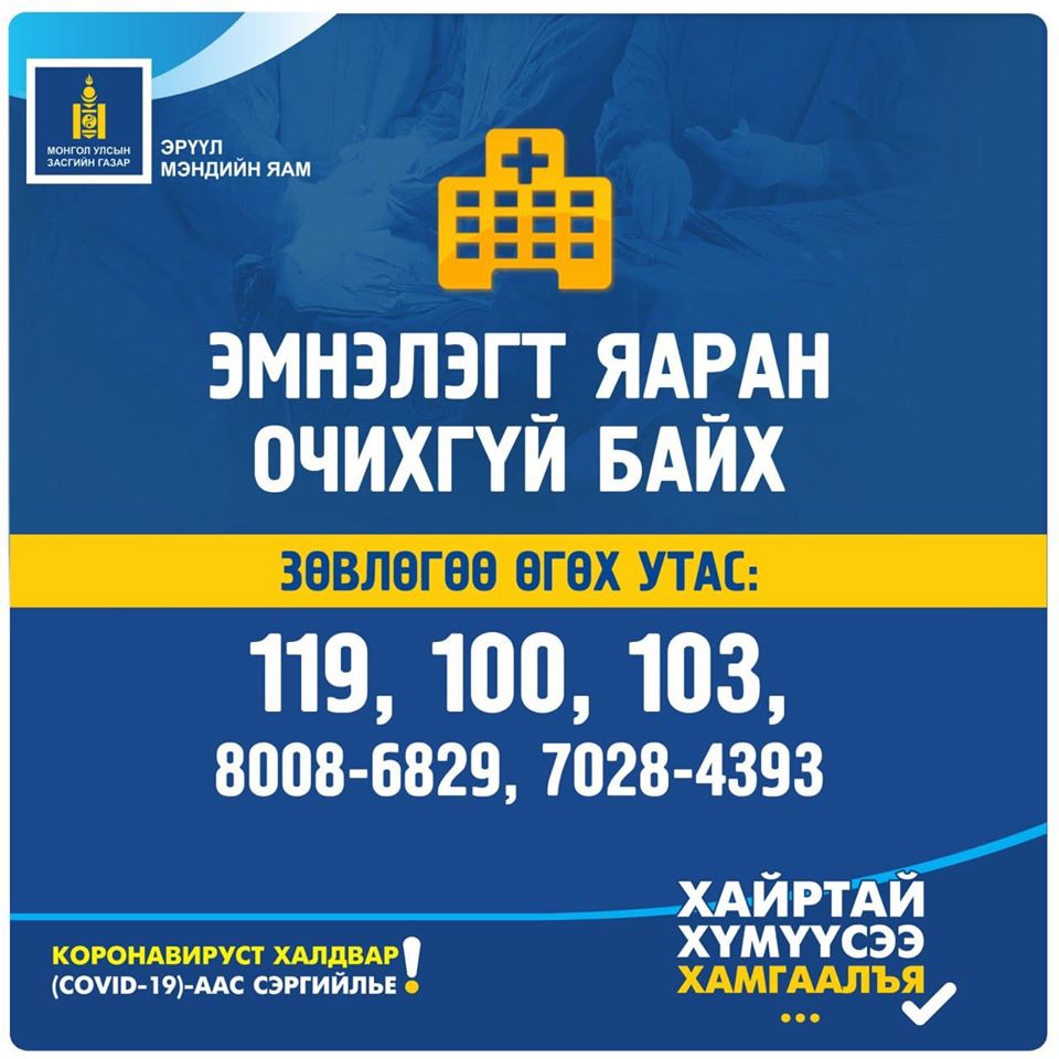 Сүүлийн 14 хоногийн хугацаанд өвчлөл гарсан улсад зорчсон, коронавируст халдвараар өвчилсөн хүнтэй ойрын хавьтал болсон, халуурах, хуурай ханиалгах, ядарч сульдах, цэр гарах, амьсгал давчдах, булчин, хоолой, толгой өвдөх, бөөлжих, гүйлгэх зэрэг шинж тэмдэг илэрвэл 119, 100, 103, 8008-6829, 7028-4393 болон өрх, сум, тосгоны эрүүл мэндийн байгууллагын утсанд хандаж зөвлөгөө аваарай.