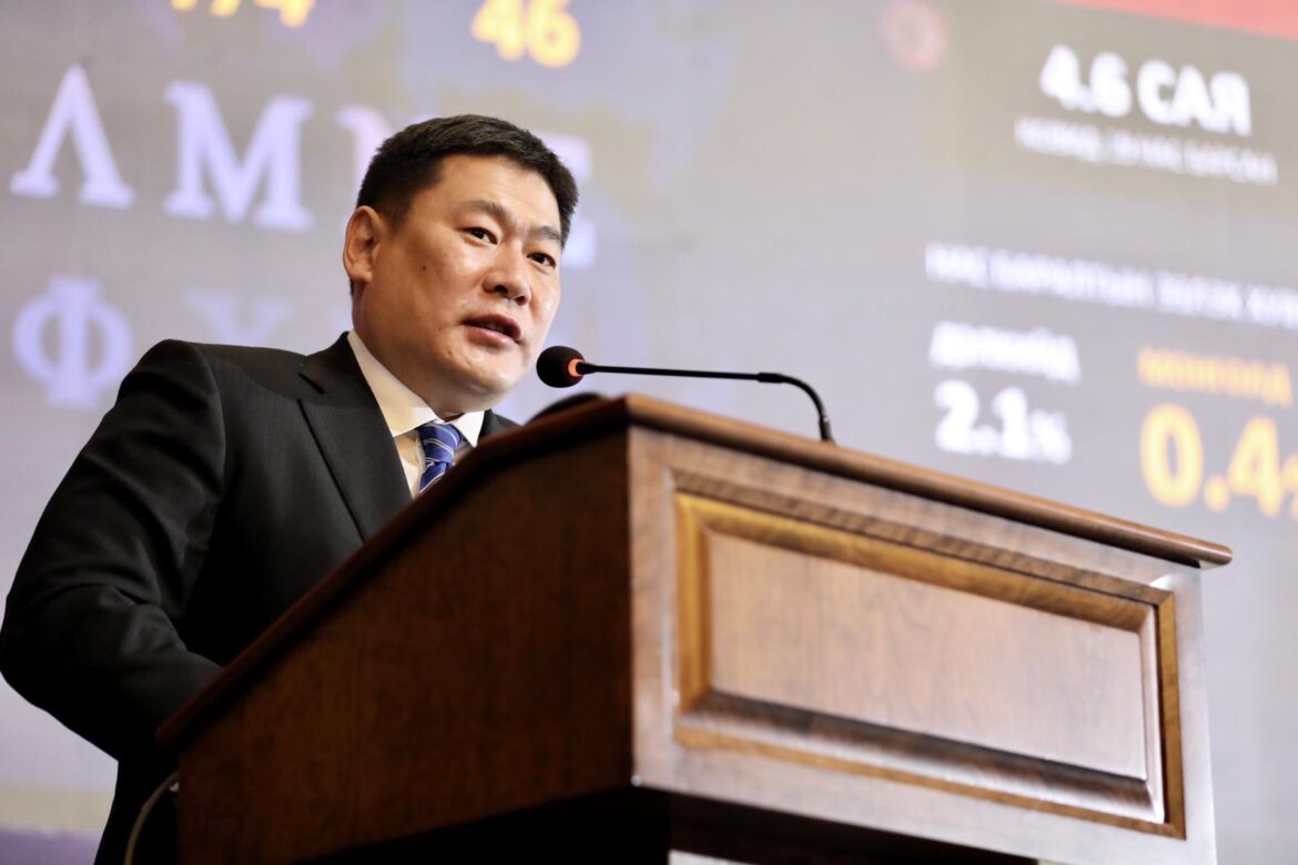 Зөвлөлдөх уулзалтад Монгол Улсын Ерөнхий сайд Л.Оюун-Эрдэнэ "Цар тахлын үеийн эдийн засгийг эрчимжүүлэх шинэ сэргэлтийн бодлого"-ын талаар илтгэл танилцуулж байна.