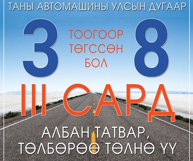 Энэ 3 дугаар сард автомашины улсын дугаар 3 болон 8 тоогоор төгссөн тээврийн хэрэгслийн эзэмшигч, жолооч нар Авто тээврийн болон өөрөө явагч хэрэгслийн албан татвар, Агаар бохирдлын болон Авто зам ашигласны төлбөрөө төлөх хуваарьтай.