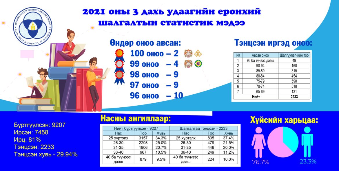 Төрийн албаны ерөнхий шалгалтыг 2021 оны 11 дүгээр сарын 15-ны өдрөөс 21-ний өдрийн хооронд аймаг, нийслэлд орон даяар зохион байгуулж дууслаа. Уг шалгалтад бүртгүүлсэн 9207 иргэнээс 7458 иргэн шалгалтаа орсон байна.
