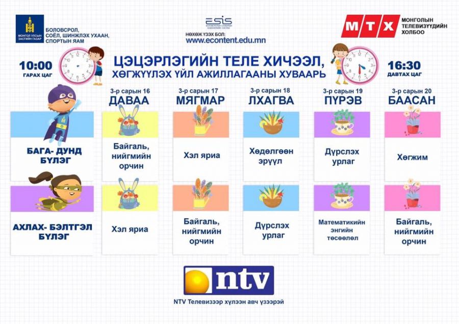 Ингээд энэ сарын 16-20-ныг хүртэлх теле хичээлийн хуваарийг танилцуулж байна.