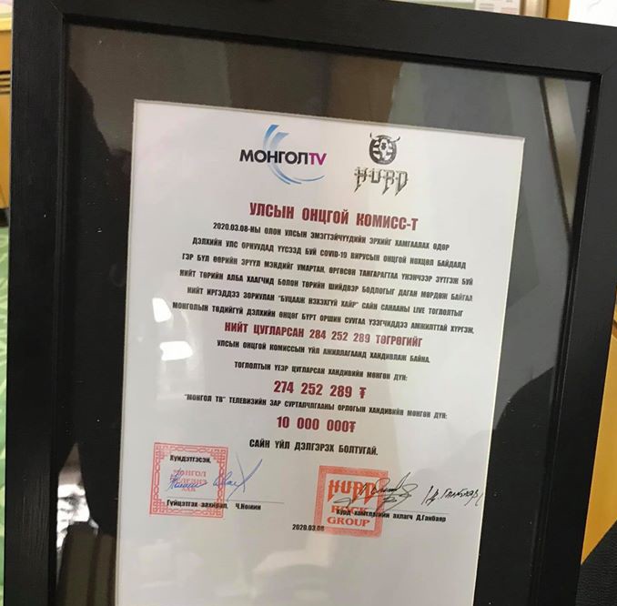 Шинэ коронавируст халдвараас урьдчилан сэргийлэх үйл ажиллагаанд дэмжлэг үзүүлэх, мэргэжлийн байгууллагуудын алба хаагчдад сэтгэлийн дэм үзүүлэх зорилгоор зохион байгуулагдсан цахим тоглолт “Монгол” телевиз болон Онцгой байдлын ерөнхий газар, Хурд, Монгол ТВ пейж хуудсаар шууд үзэгчдэд хүрсэн юм.