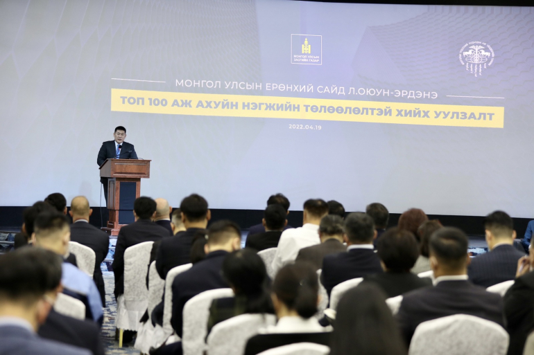Монгол Улсын Ерөнхий сайд Л.Оюун-Эрдэнэ Топ-100 аж ахуйн нэгжийн төлөөлөлтэй МҮХАҮТ-д уулзлаа. Засгийн газар 2022 оны улсын төсвийг тодотгохоор УИХ-д хуулийн төсөл өргөн мэдүүлэхээр боловсруулж байна. Ерөнхий сайд тодотголын төслийг бизнес эрхлэгчдэд танилцуулж, саналыг нь сонслоо.