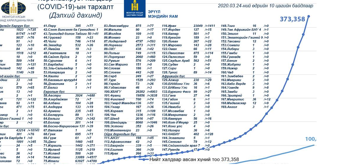 Дэлхийн хэмжээнд, 373358 (+38664) тохиолдол бүртгэгдэж, бүрэн эдгэсэн 100532 (+3086), нас барсан 16271 (+1745) байна.