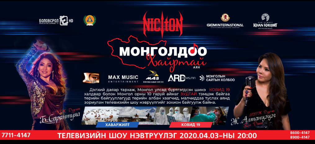 “Монголдоо хайртай” аяны онлайн концерт-д Никитон хамтлаг, МУГЖ, Зууны Манлай дуучин Б.Сарантуяа, МУГЖ, Поп дива Ж.Алтанцэцэг нар оролцоно. Тус тоглолтыг дараах фейсбүүк хуудсуудаар хүлээн авч үзээрэй.