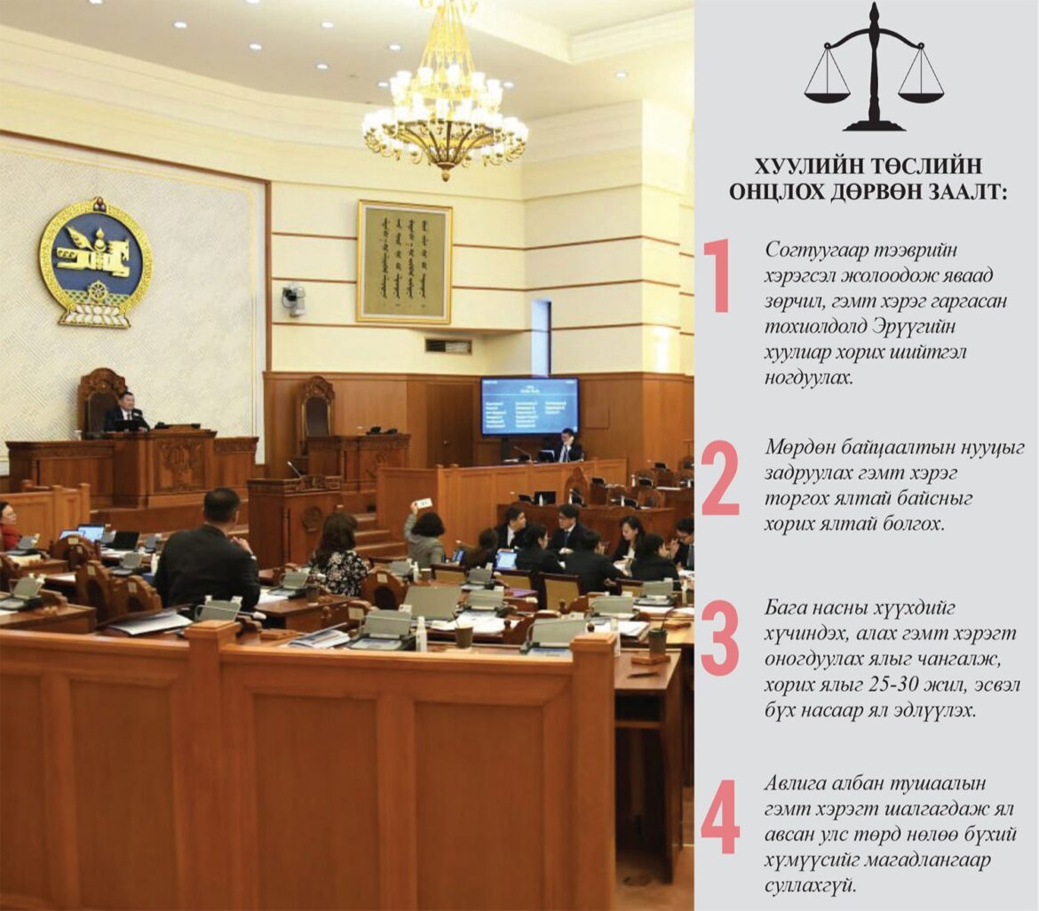 -Өнгөрсөн хугацаанд Эрүүгийн хуулийн 21.9 дэх заалтаар иргэн, хэвлэл мэдээллийн байгууллагын ажилтан хариуцлага хүлээж байгаагүй юм билээ. Энэ хуулийн заалтын дагуу иргэн, хэвлэл мэдээллийн ажилтан хариуцлага хүлээхгүй байх ёстой гэсэн зарчмыг дэмжиж байгаа учраас протоколд тэмдэглүүлэхийн тулд энэ үгийг хэлж байгаа юм. Тэр хүмүүс мөрдөн байцаалтын нууцыг задруулж, түүгээрээ хүмүүсийг шантаажилж, үүндээ хэвлэл мэдээллийнхнийг ашиглаж, шүүхэд нөлөөлөх гэж оролддог явдлыг эцэс болгох хэрэгтэй.