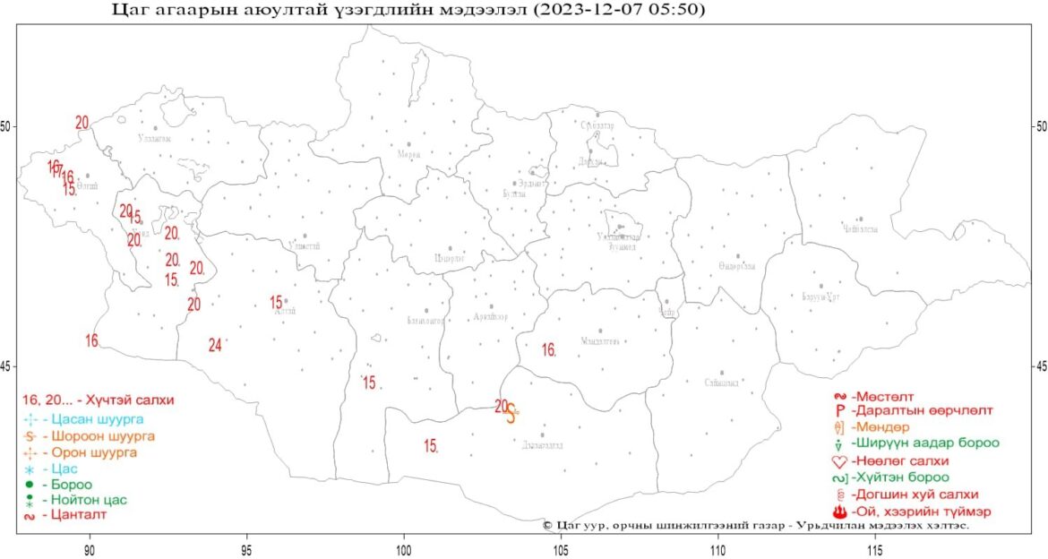 Өнөөдөр өглөөний байдлаар Ховд аймгийн Зэрэг суманд салхины дундаж хурд 27 м/с, түр зуур 43 м/с хүрч хүчтэй салхилж байна. Мөн Баянхонгор, Өвөрхангайн нутаг, Архангайн өмнөд, Өмнөговь, Дундговийн баруун хэсгээр салхи секундэд 18-20 метр, зарим үед секундэд 24 метрийг давж ширүүсэх тул болзошгүй эрсдэлээс урьдчилан сэргийлж, онцын шаардлагагүй тохиолдолд хол, ойрын замд гарахгүй байхыг ОБЕГ-аас ОНЦГОЙЛОН анхааруулж байна.
