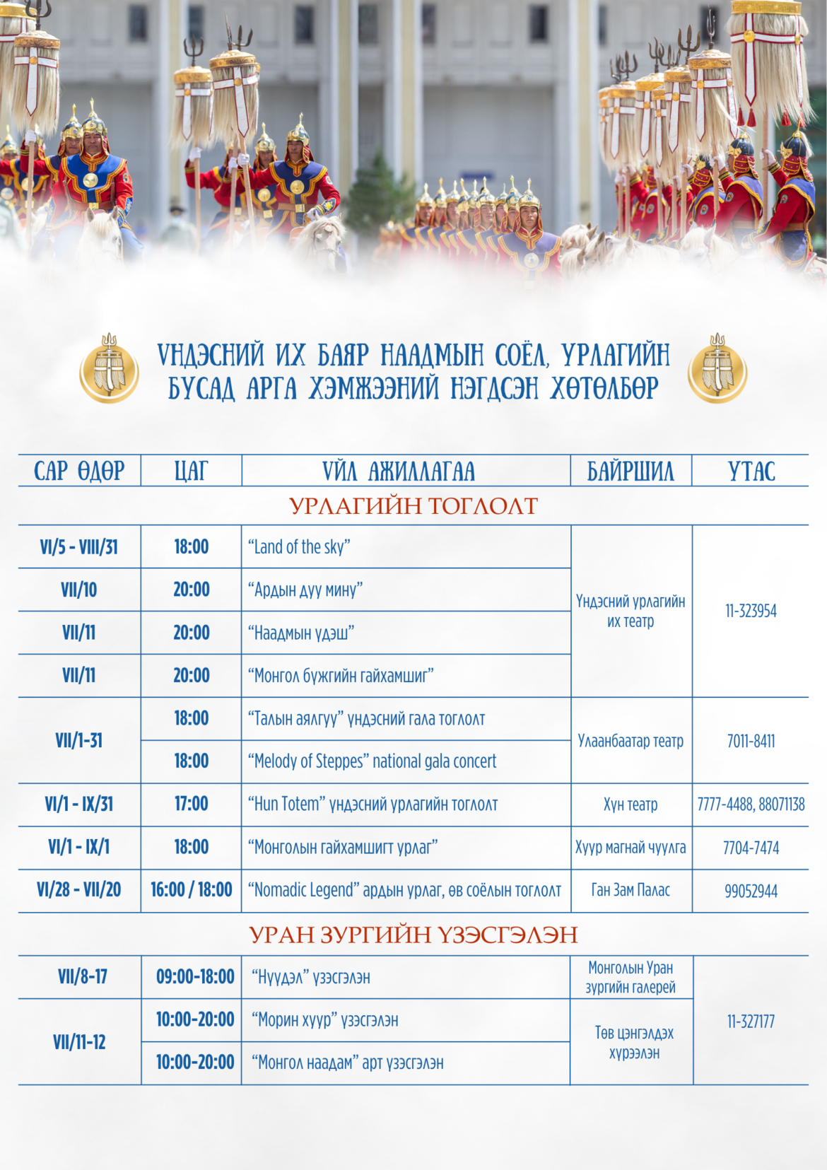 Наадмын өдрүүдэд зохион байгуулах соёл, урлагийн бусад арга хэмжээний нэгдсэн хөтөлбөрийг танилцуулж байна оруулсан Алсын Хараа 2024/07/02 2024/07/02 Share 0 FacebookTwitterPinterestEmail Тулгар төрийн 2233 жил, Их Монгол Улсын 818 жил, Үндэсний эрх чөлөө, тусгаар тогтнолоо сэргээн мандуулсны 113, Ардын хувьсгалын 103 жилийн ой, Үндэсний их баяр наадмын соёл, урлагийн бусад арга хэмжээний нэгдсэн хөтөлбөрийг танилцуулж байна. Share 0 FacebookTwitterPinterestEmail Сэтгэгдэл бичих Cancel Reply Save my name, email, and website in this browser for the next time I comment. Δ