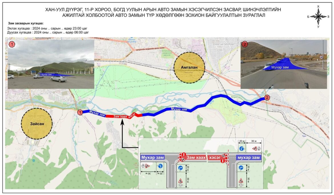 - Хан-Уул дүүрэг 8, 21 дүгээр хорооны нутаг дэвсгэр, Архивчдын гудамж, Архивын ерөнхий газраас Нисэхийн тойрог зам хүртэлх Урдаас хойшоо чиглэлийн зүүн талын авто замын 3 дугаар хэсгийн засварын ажлыг 2024 оны 10 дугаар сарын 23-ны өдрийн 23:00 цагаас 2024 оны 10 дугаар сарын 25-ны өдрийн 06:00 цагийн хооронд тус тус хааж засвар шинэчлэлийн ажил хийх ба хойноос урагш чиглэлийн баруун хэсгийн эгнээгээр тээврийн хэрэгслийн хөдөлгөөнийг сөрүүлэн зохицуулна.