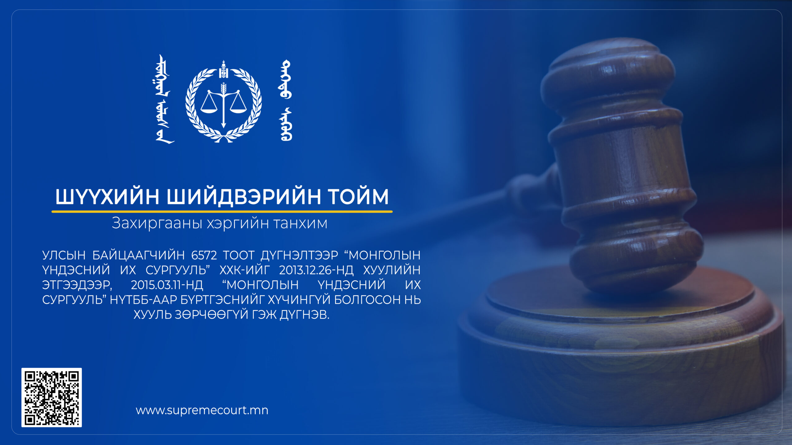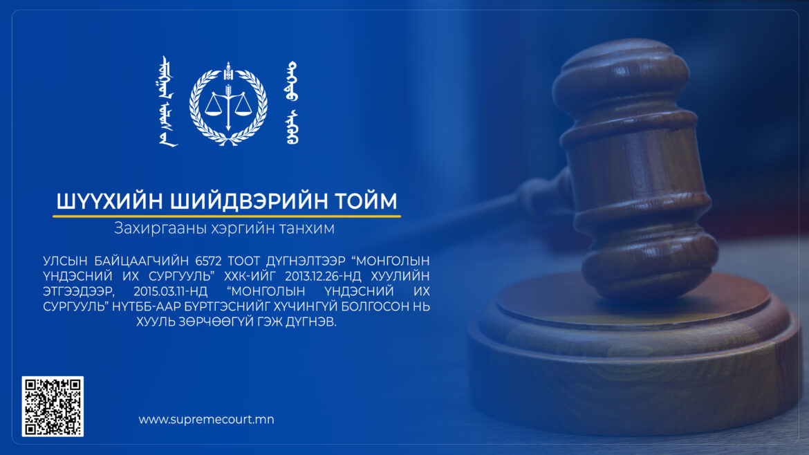 Тодруулбал, их сургуулийн үйл ажиллагаа явуулах сургалтын тусгай зөвшөөрөлтэй “Монголын үндэсний дээд сургууль” нь нэрээ өөрчлөөгүй, өөрчлөн байгуулагдаагүй байхад 2013 онд “Монголын үндэсний их сургууль” ХХК-ийг “их сургуулийн үйл ажиллагаа явуулах сургалтын тусгай зөвшөөрөлтэй” гэж шинээр бүртгэсэн нь Хуулийн этгээдийн улсын бүртгэлийн тухай хууль болон боловсролын үйл ажиллагаа эрхлэх тусгай зөвшөөрлийн талаарх хууль тогтоомжид заасан үндэслэл байгаагүй, тийм захиргааны актыг гаргах эрх хэмжээгүй этгээд шийдвэр гаргасан гэж үзэх үндэслэлтэй, иймээс улсын ахлах байцаагчийн 2022 оны 6572 дугаар шийдвэр хууль зөрчөөгүй гэж дүгнэв.