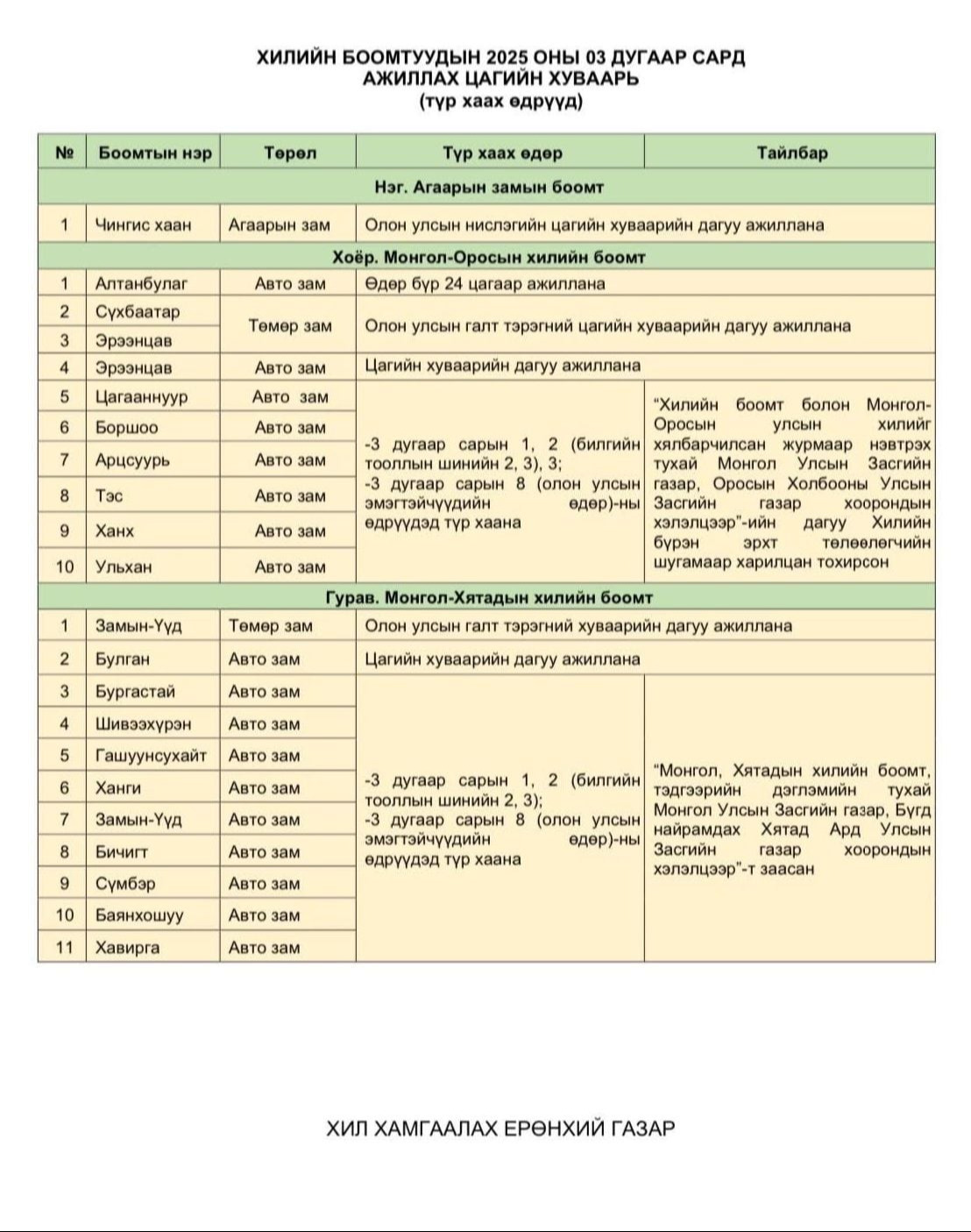 Баярын өдрүүдэд хойд хилийн боомтуудаас Эрээнцав, Алтанбулаг өмнөд хилийн боомтуудаас Булган боомт амрахгүй ажиллана. Агаарын болон төмөр замын боомтууд олон улсын нислэг, галт тэрэгний цагийн хуваарийн дагуу ажиллана.