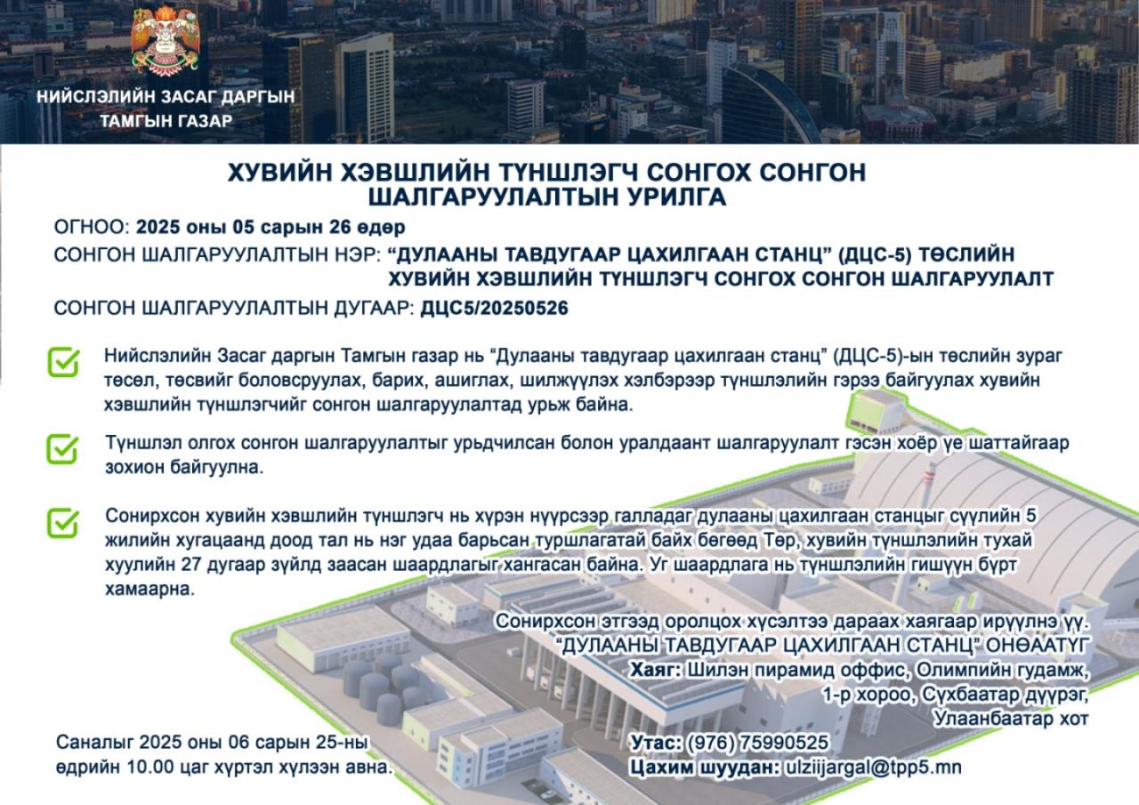 Тэгвэл НЗДТГ-аас дулааны V цахилгаан станц төслийн зураг төсөл, төсвийг боловсруулах, барих, ашиглах, шилжүүлэх хэлбэрээр түншлэлийн гэрээ байгуулах хувийн хэвшлийн түншлэгчийг сонгон шалгаруулалтад урьж байна. Ингэхдээ сонгон шалгаруулалтыг урьдчилсан болон уралдаант шалгаруулалт гэсэн хоёр үе шаттайгаар зохион байгуулна. Тодруулбал, сонирхсон хувийн хэвшлийн түншлэгч нь хүрэн нүүрсээр галладаг дулааны цахилгаан станцыг сүүлийн 5 жилийн хугацаанд доод тал нь нэг удаа барьсан туршлагатай байх бөгөөд Төр, хувийн түншлэлийн тухай хуулийн 27 дугаар зүйлд заасан шаардлагыг хангасан байна. Уг шаардлага нь түншлэлийн гишүүн бүрт хамаарах юм.