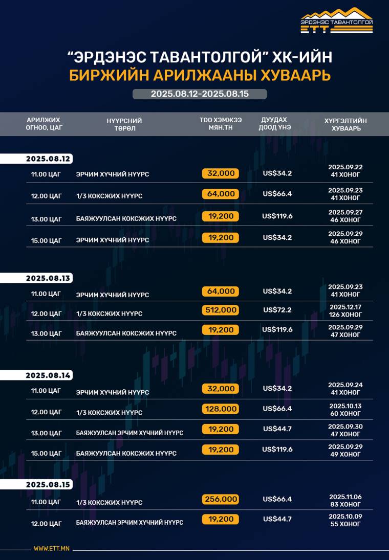 "ЭРДЭНЭС ТАВАНТОЛГОЙ" ХК-ИЙН 2025 ОНЫ 8 ДУГААР САРЫН 12-15-НЫ ӨДРҮҮДИЙН БИРЖИЙН АРИЛЖААНЫ ХУВААРЬ оруулсан Алсын Хараа 2025/08/11 2025/08/11 Share 0 FacebookTwitterPinterestEmail Share 0 FacebookTwitterPinterestEmail Сэтгэгдэл бичих Cancel Reply Save my name, email, and website in this browser for the next time I comment. Δ