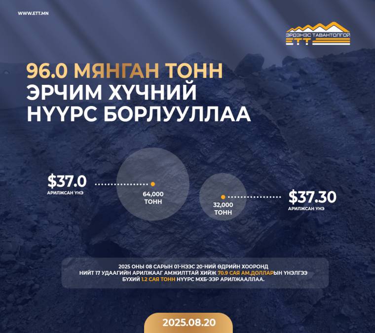 "Эрдэнэс Тавантолгой" ХК 2025 оны 8 дугаар сарын 19-ний өдөр Монголын Хөрөнгийн Биржээр дамжуулан 5 багц буюу 32.0 мянган тонн эрчим хүчний нүүрс 37.30 ам.доллароор, 8 дугаар сарын 20-ны өдөр 10 багц буюу 64.0 мянган тонн эрчим хүчний нүүрс 37.0 ам.доллароор тус тус амжилттай арилжааллаа. Арилжаанд нийт 4 оролцогч оролцож 96.0 мянган тонн эрчим хүчний нүүрс БНХАУ-ын Ганцмод боомт хүргэж өгөх нөхцөлөөр борлууллаа.