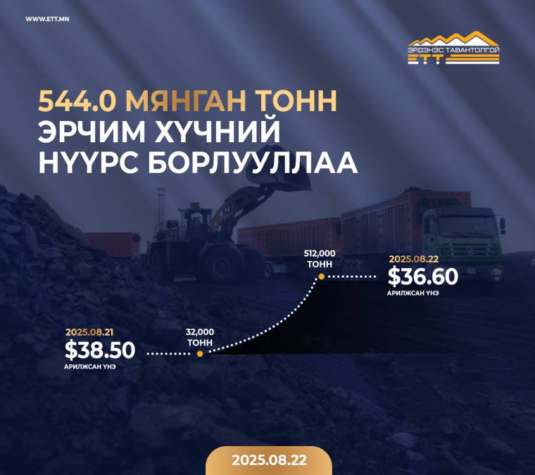 "Эрдэнэс Тавантолгой" ХК 2025 оны 8 дугаар сарын 21-ний өдөр Монголын Хөрөнгийн Биржээр дамжуулан 5 багц буюу 32.0 мянган тонн эрчим хүчний нүүрс 38.50 ам.доллароор, 8 дугаар сарын 22-ны өдөр 80 багц буюу 512.0 мянган тонн эрчим хүчний нүүрс 36.60 ам.доллароор, БНХАУ-ын Ганцмод боомт хүргэж өгөх нөхцөлөөр тус тус амжилттай арилжааллаа.