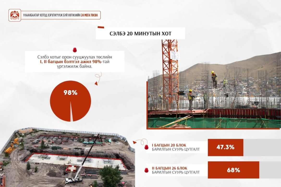 Чингэлтэй, Сүхбаатар дүүргийн 158 га талбайг хамрах 8565 өрхийн орон сууц бүхий анхны жишиг “Сэлбэ 20 минутын хот” төслийн нийт долоон багц бүтээн байгуулалтын ажил үе шаттай үргэлжилж байна. Сэлбэ хотыг орон сууцжуулах төслийн нэг, хоёрдугаар багцын бэлтгэл ажил 98 хувьтай үргэлжилж байна.