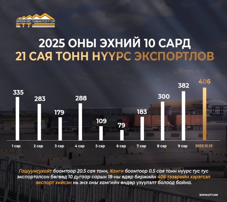 “ЭРДЭНЭС ТАВАНТОЛГОЙ” ХК 2025 ЭХНИЙ 10 САРД 21 САЯ ТОНН НҮҮРС ЭКСПОРТЛОЛОО