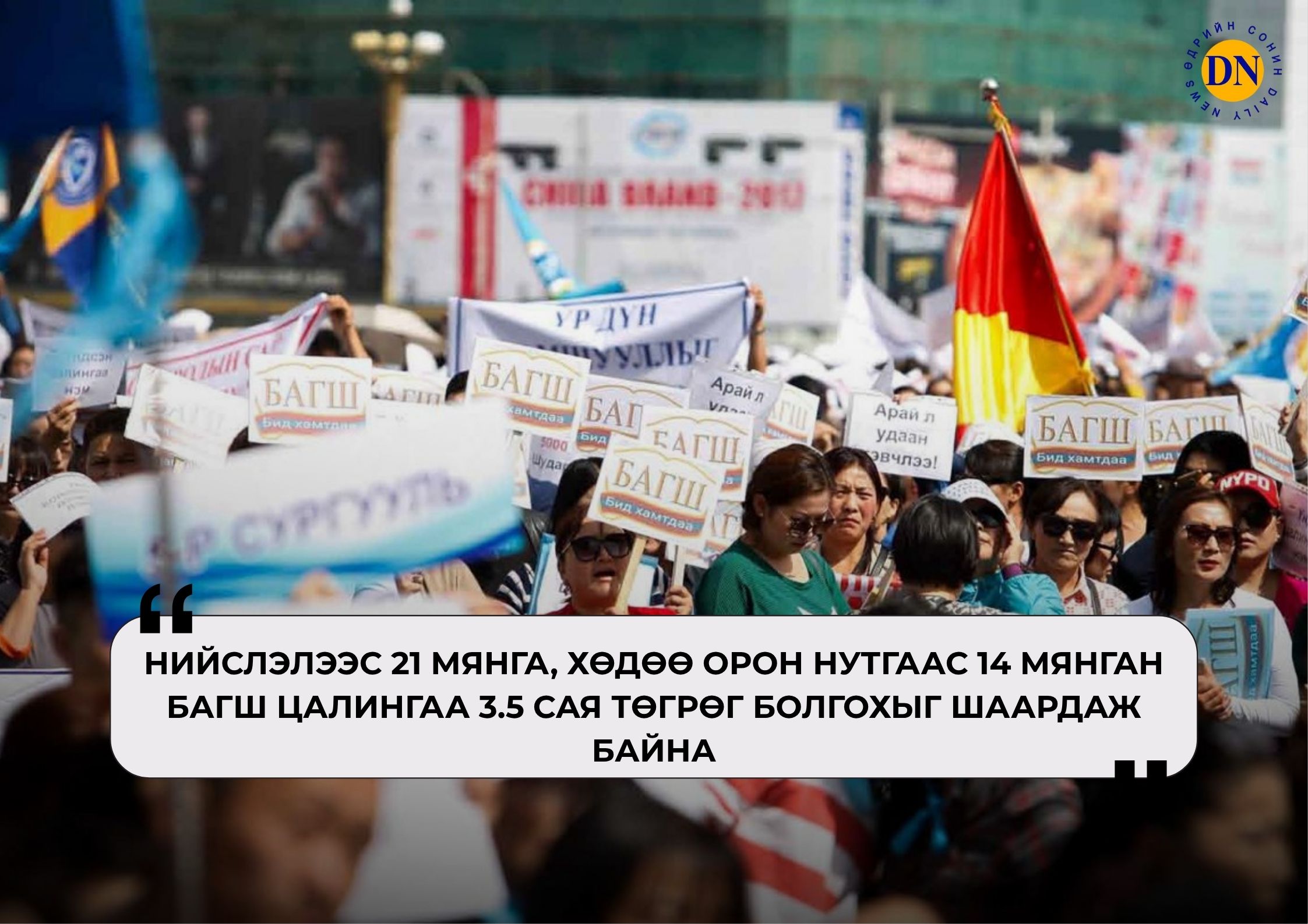 -Манайхаас багш нарын цалин хөлсийг 2026 оны нэгдүгээр сарын 1-нээс хоёр сая 500 мянга, мөн тус ондоо багтаад гурван сая 500 мянгад хүргэх юм. Бидний зүгээс Засгийн газарт олон гарц, шийдлүүдийг хэлж байгаа. Нэгдүгээрт, төсвөө эргүүлэн татаад хуулийн хугацаанд нь буцаж өргөн мэдүүл. Энэ хугацаандаа төсвийн хуваарилалтаа өөрчлөх хэрэгтэй. Хоёрдугаарт, хуулийн заалт зөрчинө гэх асуудал буюу нийт урсгал зардлын 25 хувьд цалин хөлс байна гэх асуудлаа цэгцэл. Төсвийн тухай хуулиар 30 хүртэлх хувь гэж заасан байгаа. Хамгийн сүүлд хэлэхэд, одоо тавьж байгаа шаардлагыг биелүүлэх шаардлагатай. Үгүй бол ажил хаялт үргэлжилсээр байна. Гэтэл П.Наранбаяр сайд бидэнд ямар ч боломж байхгүй. Үйлдвэрчний эвлэл бидэнтэй уулзаж, тохиролцохгүй байна гэх асуудлыг тавьсан. Тодорхой шийдэлтэй хариу өгөхгүйгээр 20 хувийн нэмэгдэл гэдэг чинь өнөөдрийн худалдан авах чадварыг гүйцэхгүй тоо шүү. Уг нь багш нарын цалинг жил бүр 30, 30 хувиар нэмэгдүүлээд явсан бол гурван сая орчим төгрөг болох байсан. 2025 оныг 2018 онтой харьцуулахад 136 хувиар худалдаг авах чадвар унасан байна. Харин 2021 оноос хойш 76 хувиар худалдан авах чадвар уналтад орсон. Тиймээс багш нарын цалин хөлсийг заавал 2.5-3.5 мянган төгрөг болгох шаардлагатай. Бид олон судалгаа харж байна. Жишээлбэл, багшийн цалин дунджаар 460 орчим ам.доллар. Гэтэл нэг хүн Монголд амьдрах сарын амьжиргааны өртөг нь 571 ам.доллар буюу хоёр сая 100 мянга орчим төгрөг байдаг гэнэ. Тиймээс энэ тоог давж байж багш нар наад захын хэрэгцээгээ хангах асуудал үүснэ. Дээрээс нь маш их хүний нөөцийн дутагдал байгаа учраас үүнийг дагаад ажлын ачаалал үүсч байна. Тиймээс бид цалингаа гурван сая 500 мянгад хүргэнэ. Үгүй бол хугацаагүй ажил хаялт үргэлжлээд л явна.