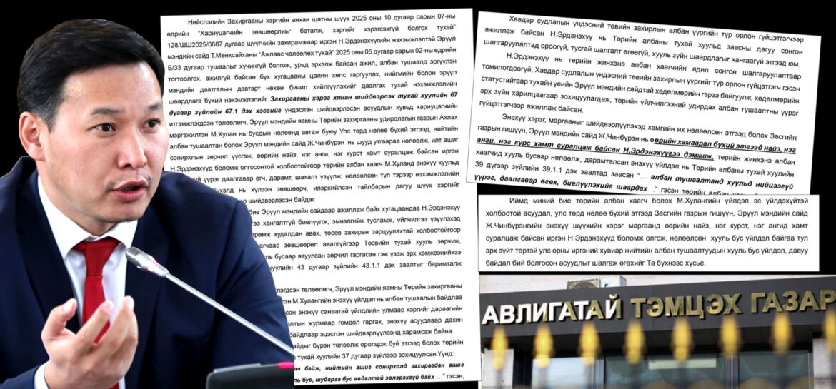Тэрбээр Дээд шүүхийн ерөнхий шүүгч Д.Ганзоригт 2025 оны арваннэгдүгээр сарын 4-нд хандахдаа “…Энэхүү хэрэгт Эрүүл мэндийн сайдыг бүрэн төлөөлж оролцож буй этгээдийн болох төрийн албан хаагч М.Хулан нь хуулиар хүлээсэн үүргээ биелүүлэлгүй ЭМЯ-ны эрх ашиг, сонирхлыг үл хүндэтгэлээ. Би Эрүүл мэндийн сайд байхдаа Н.Эрдэнэхүүг албаны үүргээ хангалтгүй биелүүлж, эмнэлгийн тусламж, үйлчилгээ үзүүлэхэд шаардлагатай тоног төхөөрөмж худалдан авах, төсөв захиран зарцуулахтай холбоотойгоор төсвийн ерөнхийлөн захирагчаас зөвшөөрөл авалгүйгээр худалдан авах ажиллагааг хууль бусаар явуулсан гэж үзэж эрх хэмжээнийхээ хүрээнд Хөдөлмөрийн тухай хуулийг баримталж шийдвэрлэсэн. ХСҮТ-ийн захирлын албан үүргийн түр орлон гүйцэтгэгчээр ажиллаж байсан Н.Эрдэнэхүү нь Төрийн албаны тухай хуульд заасны дагуу сонгон шалгаруулалтад ороогүй, тусгай шалгалт өгөөгүй, төрийн жинхэнэ албан хаагчийн адил сонгон шалгаруулалтаар томилогдоогүй, ХСҮТ-ийн захирлын үүргийг түр орлон гүйцэтгэгч гэсэн статустайгаар тухайн үеийн Эрүүл мэндийн сайдтай хөдөлмөрийн гэрээ байгуулж, хөдөлмөрийн харилцаагаар зохицуулагдаж байсан төрийн үйлчилгээний удирдах албан тушаалтны үүрэг гүйцэтгэгч юм. Иймд гомдол, мэдээлэлд дурдсан асуудлын дагуу хяналт, шалгалт явуулж, энэхүү хэргийн харьяалал зөрчсөн хөдөлмөрийн ганцаарчилсан маргаантай холбоотой асуудалд анхаарал хандуулж, шүүгчийн захирамжид хуулийг зөв хэрэглэх талаар дүгнэлт, зөвлөмж гаргаж өгнө үү” гэжээ.