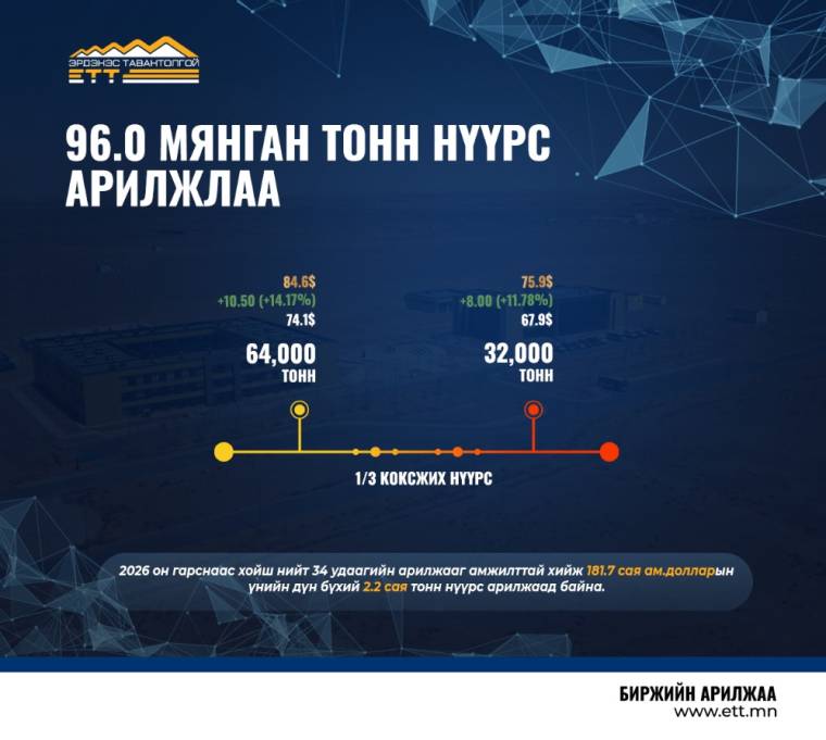 2026 онд 34 удаагийн арилжаагаар 181.7 сая ам.долларын үнийн дүн бүхий 2.2 сая тонн нүүрс арилжлаа.