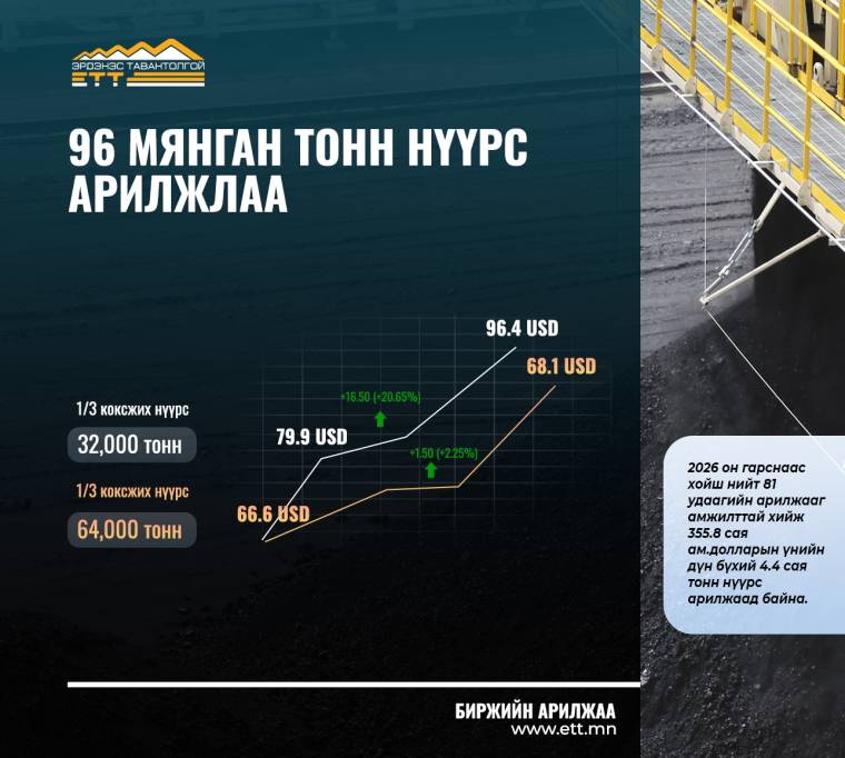 2026 онд 81 удаагийн арилжаагаар 355.8 сая ам.долларын үнийн дүн бүхий 4.4 сая тонн нүүрс арилжлаа.