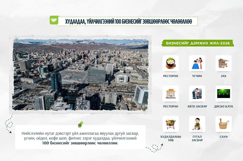 Энэ хүрээнд хоол үйлдвэрлэл, гутал засвар, үсчин, оёдол, кофе шоп, фитнес зэрэг нийт 146 төрлийн бизнесийг зөвшөөрлийн шаардлагаас чөлөөлсөн байна. Мөн нийслэл 2026 оныг “Бизнес эрхлэгчдийг дэмжих жил” болгон зарлаж, Засгийн газрын дээрх санаачилгыг бүрэн дэмжин ажиллахаа Хотын дарга Х.Нямбаатар мэдэгдлээ.