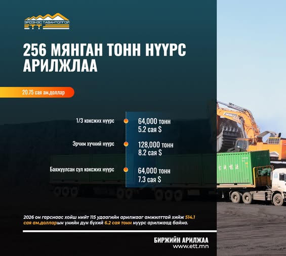 2026 онд 115 удаагийн арилжаагаар 514.1 сая ам.долларын үнийн дүн бүхий 6.2 сая тонн нүүрс арилжлаа.