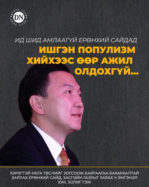 Мэдээжээр: Н.Учралын яриад байгаа цалинг цаваг хэрэгтэй. Тоо томшгүй зөвшөөрөл хэрэггүй. Гэвчиг: Мань Н.Учрал цалинг нь яриад, хэдэн зөвшөөрлийг сул тавьчихад эд нар яадаг юм гэж хандаж байна. Тийм биш. Уул нь: Ерөнхий сайд болж байгаа хүн Н.Учрал шиг: Ид шид бүтээхгүй буюу юу ч хийхгүй гэж хэлдэггүй. Хэн нэг улстөрч Ерөнхий сайд болохдоо ид шидийг амладаг. Амлах ёстой. Ерөнхий сайд ид шид амлаж, гайхамшиг бүтээхээ гайхуулж байж сонгогдож, томилогддог. Ард нийт хүсэл мөрөөдөлтэй байх ёстой. Тэрхүү хүсэл мөрөөдлийг төр өгч байх үүрэгтэй. Тэгэхийн төлөөнөө: Мега төсөлтэй, мөрөөдөлтэй Ерөнхий сайд Монголд хэрэгтэй. Харин Н.Учрал тэр Ерөнхий сайд биш байна. Биш гэдэг нь хэдхэн өдрийн ажлаас нь харагдлаа. Хэрэгтэй мега төслийг зогсоож байгаагаа бахархалтай зарлах Ерөнхий сайд, Засгийн газрыг харах ч эмгэнэл юм, золиг гэж. Ид шид амлаагүй Ерөнхий сайдад ишгэн популизм хийхээс өөр ажил олдохгүй л байх...
