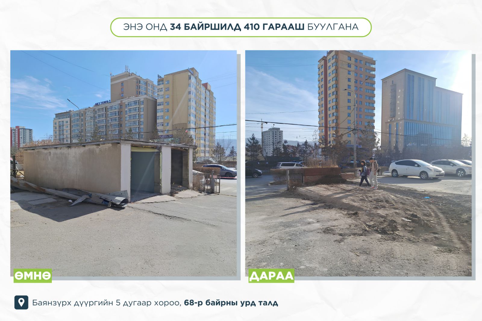 Харин “Гарааш” арга хэмжээний хүрээнд долоон дүүргийн нутаг дэвсгэрт 34 байршилд 410 гарааш буулгах юм. Өнөөдрийн байдлаар 14 байршилд 140 гарааш буулгаж, нийт 2520 ам метр талбайг чөлөөллөө. “Гарааш” арга хэмжээний хэрэгжилт 34.2 хувийн явцтай үргэлжилж байна. Хашаа, хайс, гарааш буулгаж чөлөөлсөн талбайг нийтийн эзэмшлийн зориулалтаар ашигладаг.