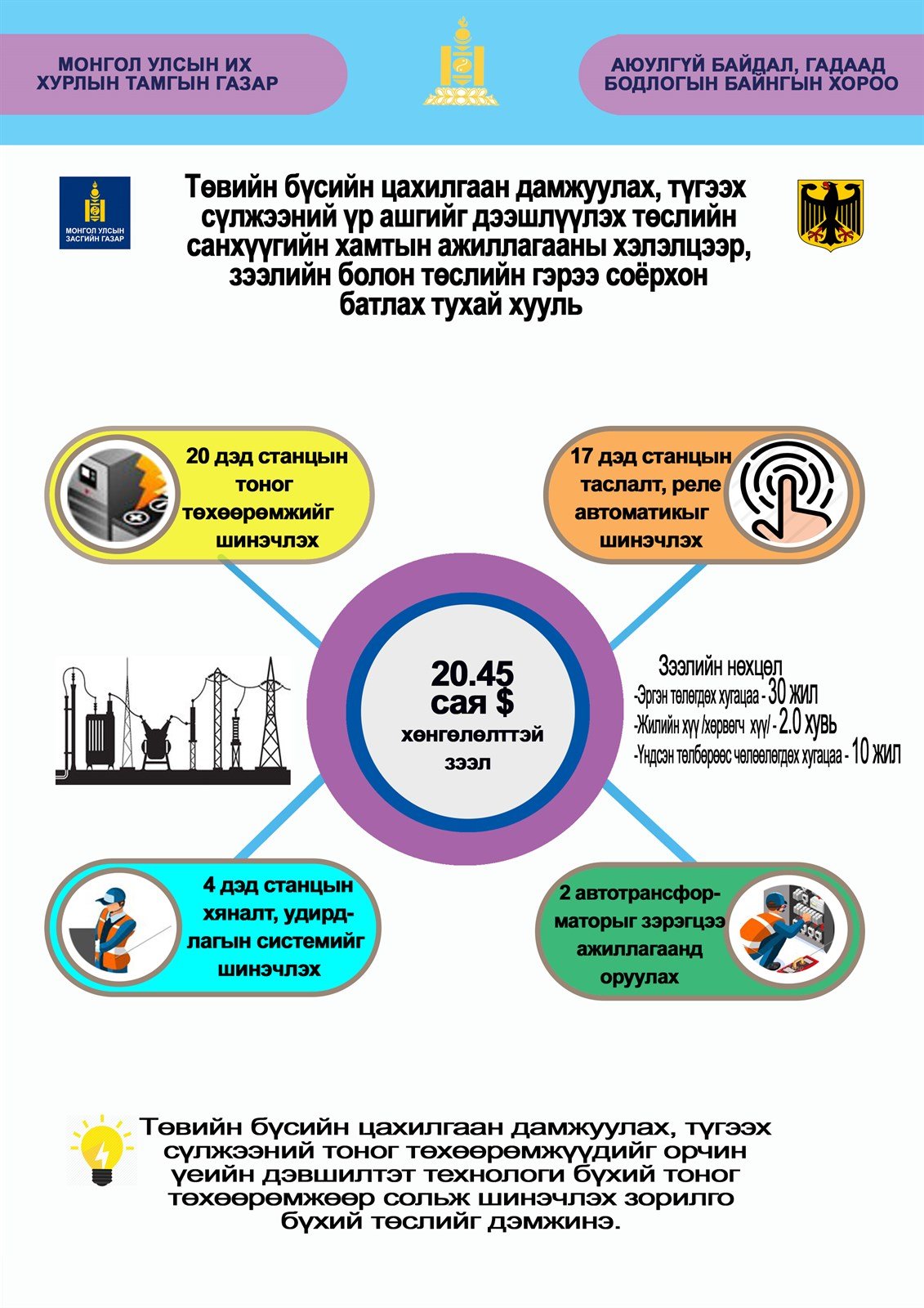 Санхүүгийн хамтын ажиллагааны хэлэлцээр болон Зээлийн болон төслийн гэрээг соёрхон баталснаар ХБНГУ-ын Засгийн газрын 20.45 сая еврогийн хөнгөлөлттэй зээлээр дараах 4 үндсэн үйл ажиллагааг гүйцэтгэнэ. Үүнд: